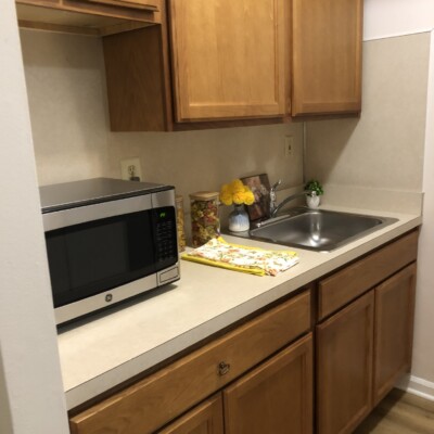 A kitchenette with sink, cupboards, microwave